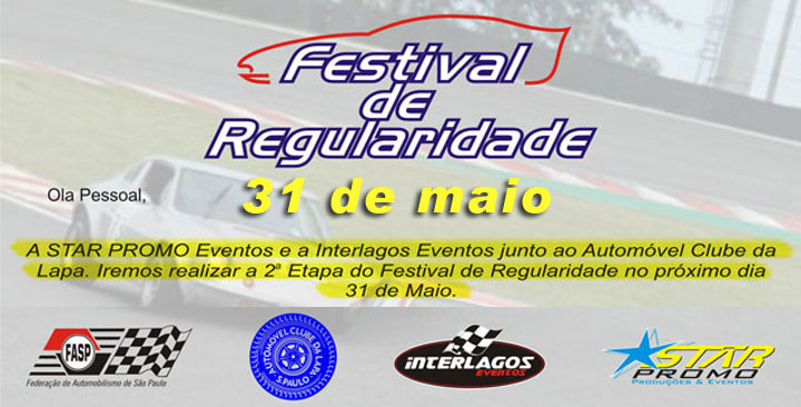 A segunda etapa do festival de regularidade, acontecerá no dia 31 de maio em Interlagos. Quem participou da primeira etapa, é só confirmar enviando um email da sua participação para festival@brasileiroderegularidade.com.br.