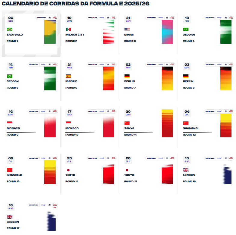 Fórmula E e Campeonato Mundial ABB FIA de Fórmula E: Como o primeiro campeonato mundial totalmente elétrico da FIA e o único esporte com plano certificado para emissões líquidas zero, o Campeonato Mundial ABB FIA de Fórmula E traz corridas emocionantes para o coração das cidades mais icônicas do mundo, proporcionando uma plataforma de automobilismo de elite para os principais fabricantes automotivos do mundo acelerarem a inovação de veículos elétricos. A rede de equipes, fabricantes, parceiros, emissoras e cidades-sede da Fórmula E está unida pela paixão pelo esporte e pela crença em seu potencial para acelerar o progresso humano sustentável e criar um futuro melhor para as pessoas e o planeta.