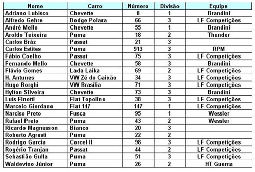 Abaixo, a lista dos 22 participantes confirmados, e os 12 modelos diferentes de carros que participarão deste evento: