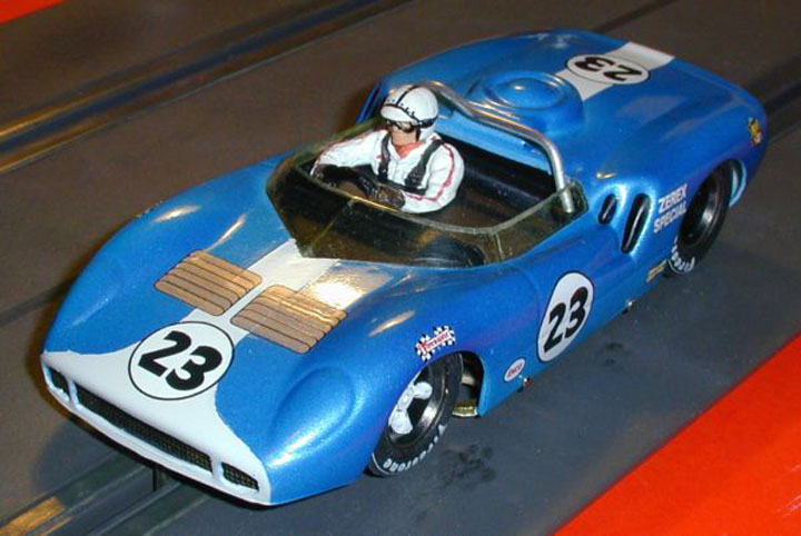 Somente escala 1/32, não havia 1/24 em nossas terras. Lá se digladiavam os Ford GTs, Cheetahs, Lolas GT e T-70, Cooper-Ford, Ferraris GTO e 275P, Porsche 904, etc, fabricados na sua quase totalidade pela Monogram e pela Cox. Nos intervalos das corridas, íamos babar nas vitrines da saudosa Hobby Center, ao lado da hoje também extinta Modern Sound, sempre repleta de novidades vindas dos Estados Unidos. As carrocerias de bolha começavam a aparecer no mercado, e o interesse maior era pelos modelos não produzidos pelas supracitadas fábricas. Dentre esses modelos, um spider me chamou atenção, não pela forma, mas pelo fato de ter um filtro de ar, enquanto todos os outros carros aparentavam as cornetas dos carburadores. Como tratava-se de algo que eu não via em nenhuma revista de automobilismo da época, perguntei que carro seria aquele: