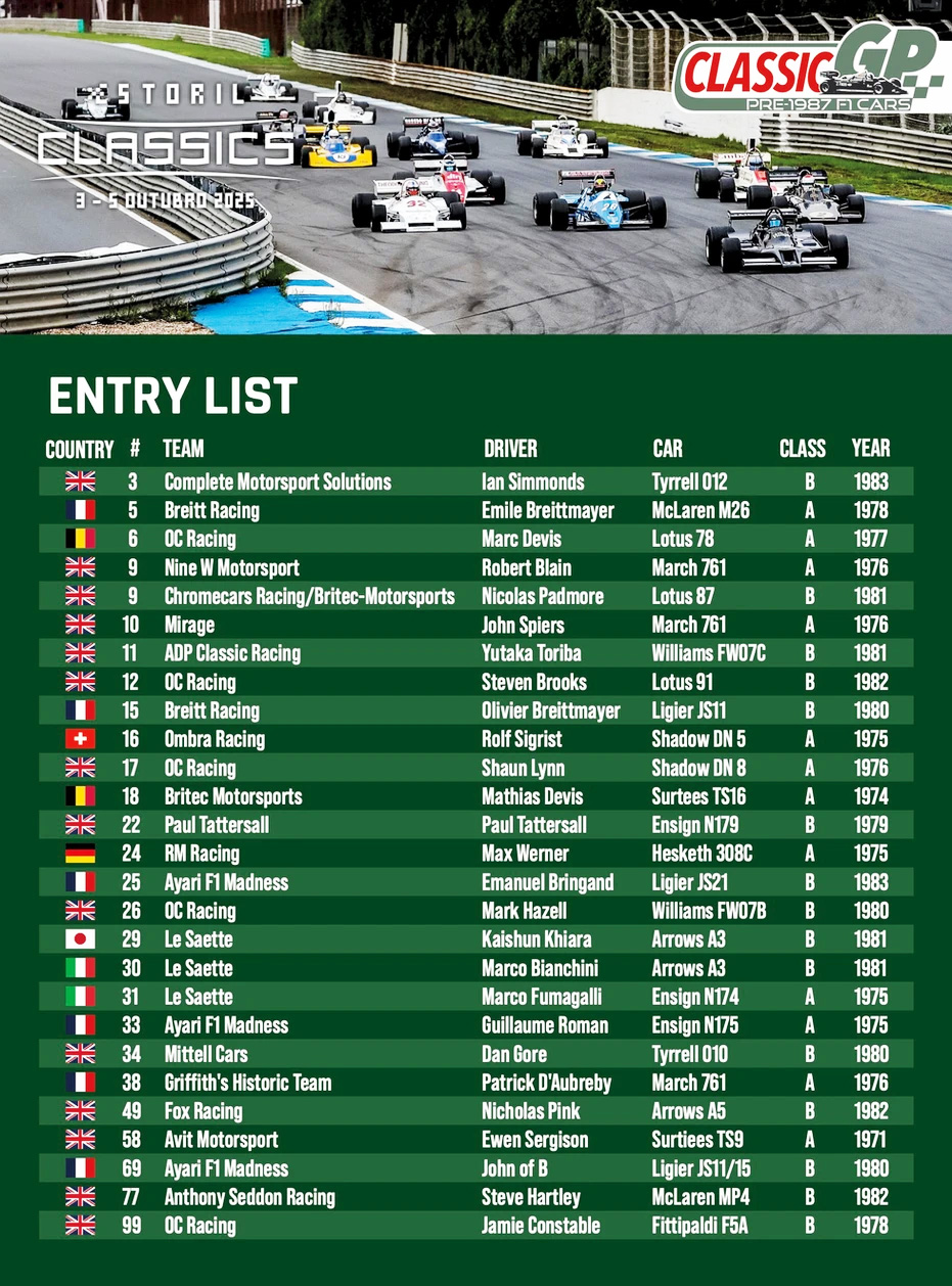 O Classic GP, do programa do Estoril Classics, apresentou na edição de 2025 a melhor lista de inscritos, reunindo alguns dos carros emblemáticos da história da Fórmula 1 para celebrar os 75 anos da categoria. O evento volta a transformar o Autódromo do Estoril num autêntico museu vivo, onde a história da modalidade é reconstituída com fidelidade histórica