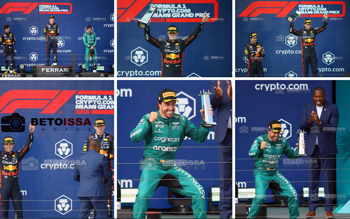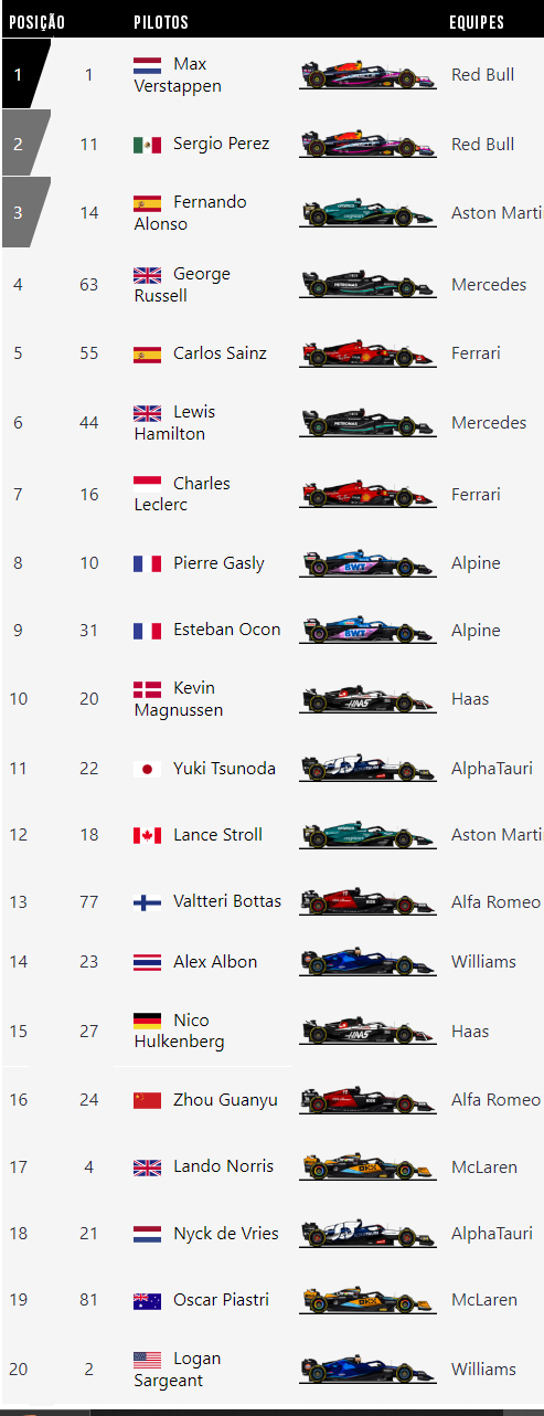 Fernando Alonso, da Aston Martin, juntou-se à dupla da Red Bull no pódio para registrar seu quarto resultado entre os três primeiros da temporada, à frente de George Russell, da Mercedes. Atrás deles, Carlos Sainz terminou em quinto, mas sua classificação final incluiu uma penalidade de cinco segundos por excesso de velocidade no pitlane.