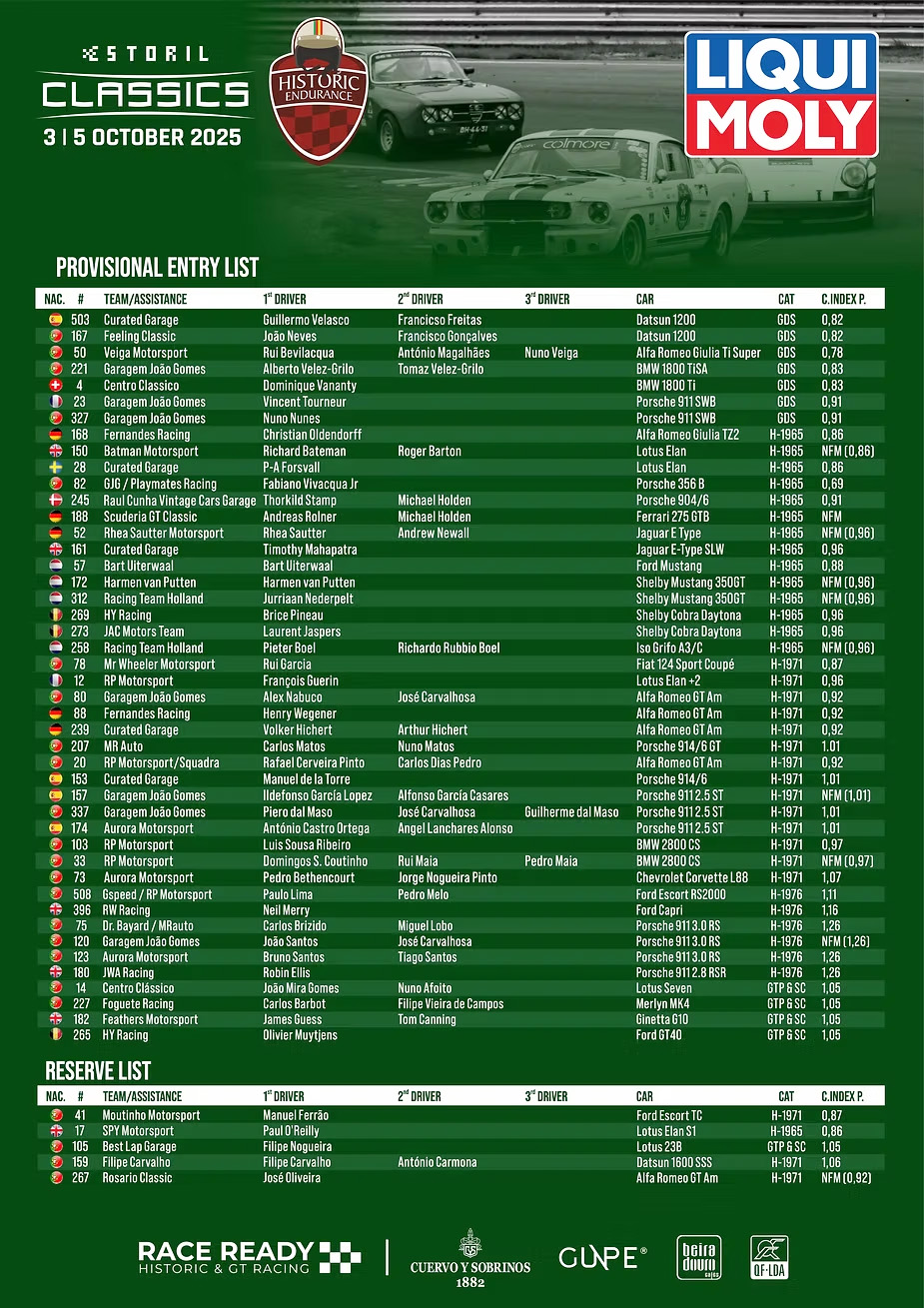 Com o apoio da Liqui Moly — marca de referência mundial que disponibiliza uma gama ímpar de produtos para o setor automóvel, desde óleos de motor e aditivos a lubrificantes, massas, sprays de manutenção, cuidados para o veículo, bem como soluções adesivas e selantes — a prova afirma-se como uma das mais relevantes do calendário. Reunindo pilotos e equipes da mais prestigiada competição de clássicos do sul da Europa, apresentando uma lista de inscritos excecionalmente rica e diversificada, tendo um espetáculo de primeira ordem com o confronto entre carros de Turismo, GT e Protótipos que marcaram a história do automobilismo até 1976.