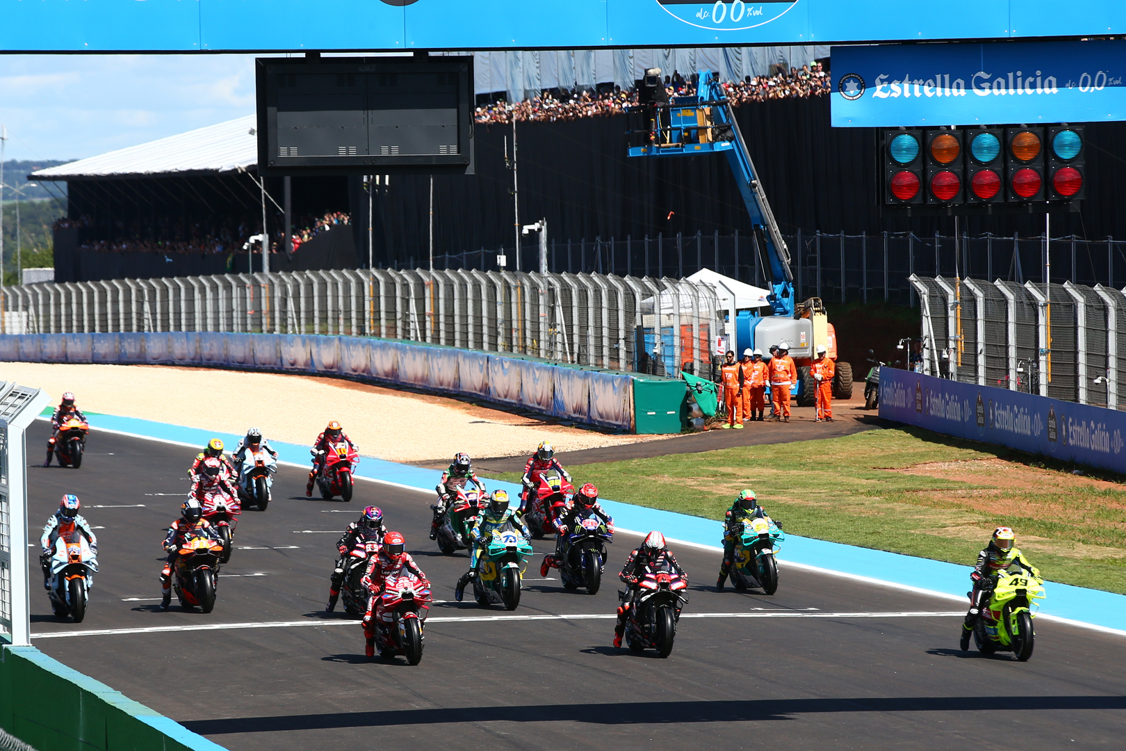 A decisão não diminuiu a emoção na pista, principalmente na largada. Vencedor da primeira corrida do ano, na Tailândia, Bezzecchi superou o pole Fabio Di Giannantonio e assumiu a ponta antes da primeira curva. Na sequência, vinham Márquez e