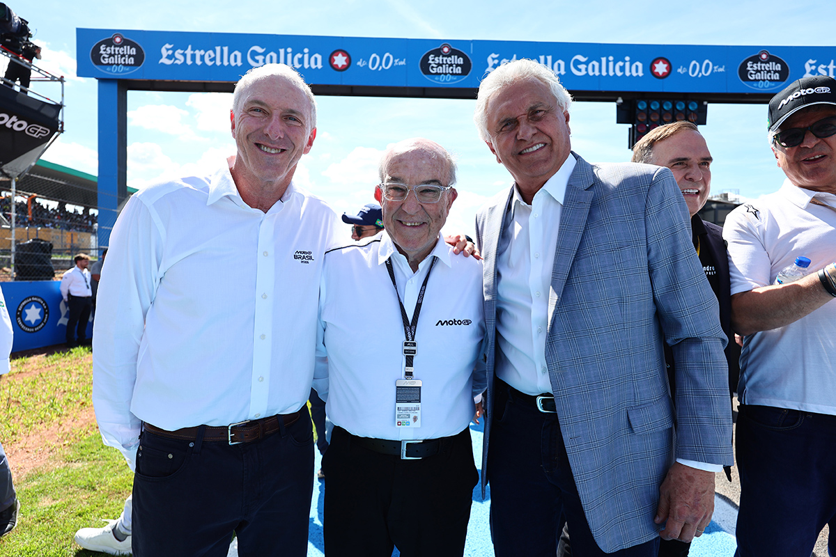 Alan Adler [CEO da Brasil Motorsport e Organizador], Carmelo Ezpeleta [presidente da Dorna, promotora da MotoGP] e Ronaldo Caiado [Governador do Estado de Goiás] Betoissaphotos / MotoGP Brazil 2026