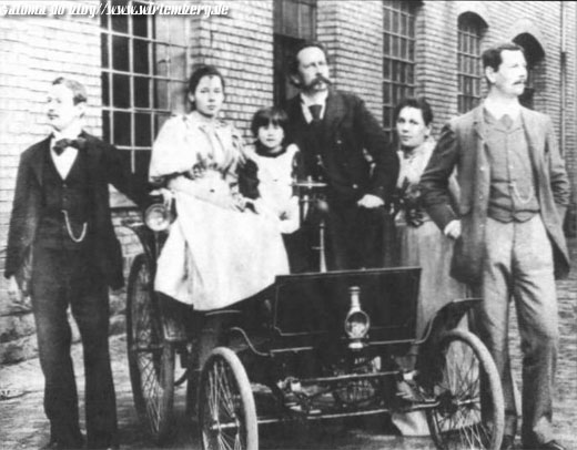 O Clã Benz, Bertha Benz, em pé ao lado de Karl Benz, sentado no quadricíclo, com os filhos, Eugen e Richar…