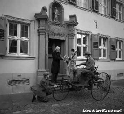 Bertha Benz, com o primeiro carro de três rodas e um cilindro a gasolina em frente a uma farmácia, 1886…